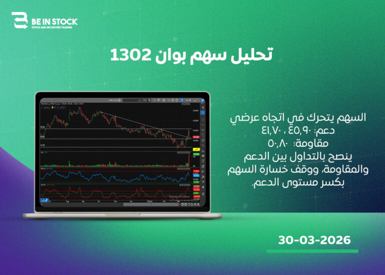 السهم يتحرك في اتجاه عرضي دعم: 4.80 ، 4.50 مقاومة: 5.60 ، 6.30 ينصح بالتداول بين الدعم والمقاومة، ووقف خسارة السهم بكسر مستوى الدعم.