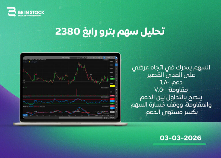 السهم يتحرك في اتجاه عرضي على المدى القصير دعم: 6.80 مقاومة: 7.50 ينصح بالتداول بين الدعم والمقاومة، ووقف خسارة السهم بكسر مستوى الدعم.