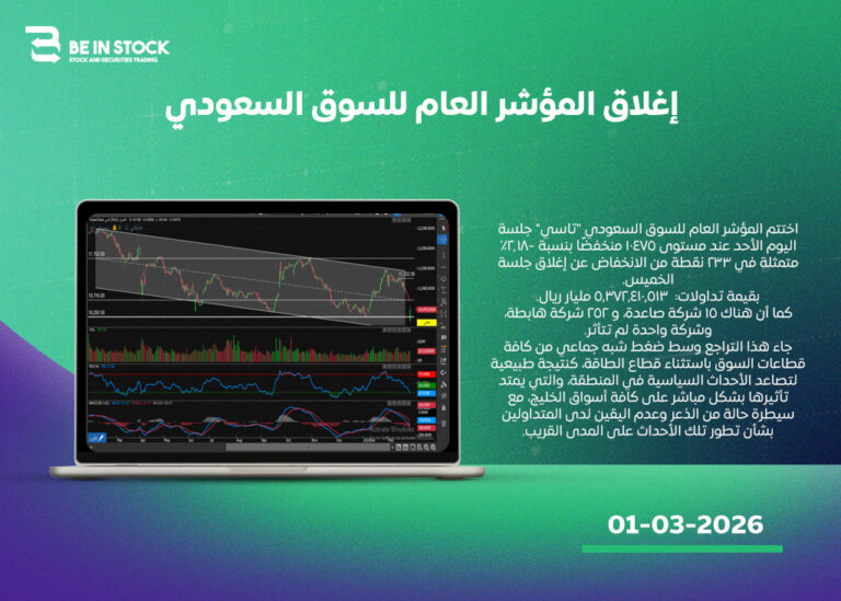 اختتم المؤشر العام للسوق السعودي “تاسي” جلسة اليوم الأحد عند مستوى 10475 منخفضًا بنسبة -2.18% متمثلة في 233 نقطة من الانخفاض عن إغلاق جلسة الخميس.