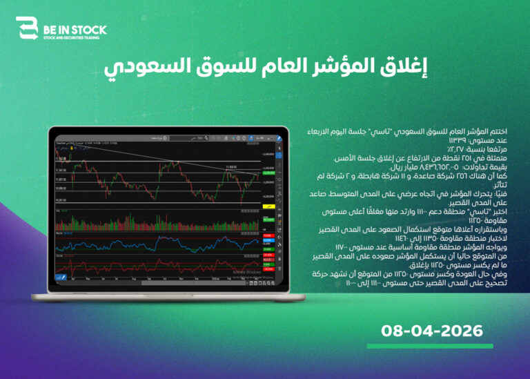 اختتم المؤشر العام للسوق السعودي “تاسي” جلسة اليوم الاربعاء عند مستوى: 11339مرتفعا بنسبة: 2.27%متمثلة في 251 نقطة من الارتفاع عن إغلاق جلسة الأمس.بقيمة تداولات: 8,436,652,005