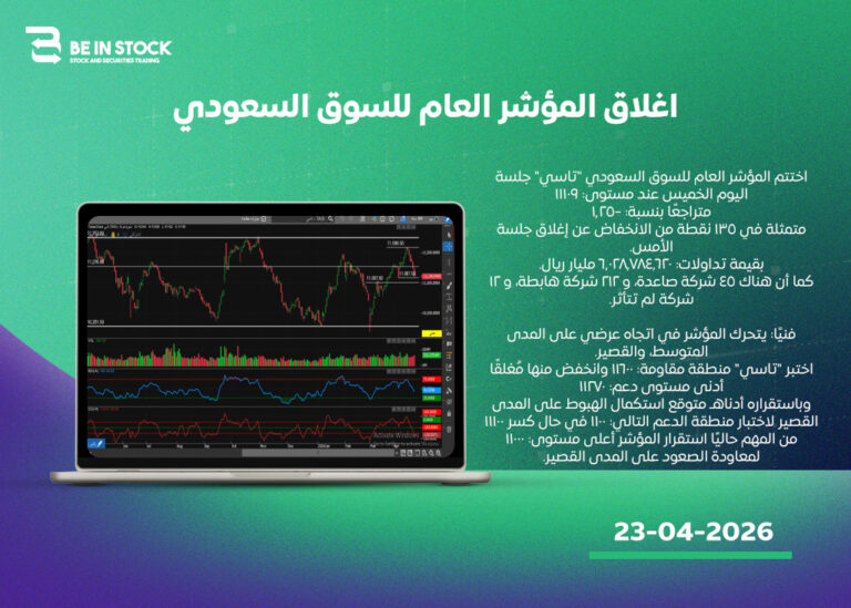 اختتم المؤشر العام للسوق السعودي “تاسي” جلسة اليوم الخميس عند مستوى: 11109متراجعًا بنسبة: -1.25متمثلة في 135 نقطة من الانخفاض عن إغلاق جلسة الأمس.بقيمة تداولات: 6.028,784,620