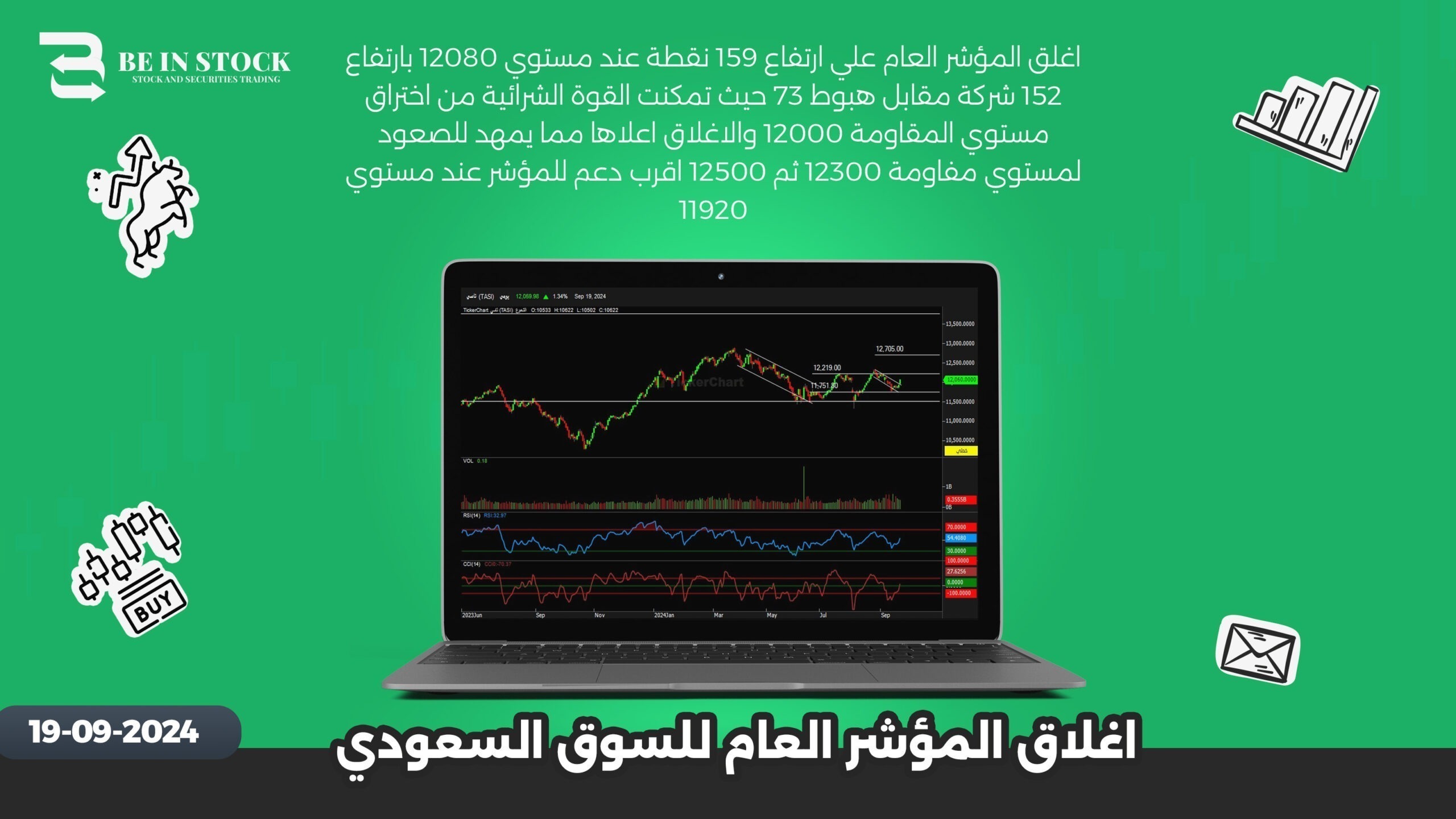 اغلق المؤشر العام علي ارتفاع 159 نقطة عند مستوي 12080 بارتفاع 152 شركة مقابل هبوط 73 حيث تمكنت القوة الشرائية من اختراق مستوي المقاومة 12000 والاغلاق اعلاها مما يمهد للصعود لمستوي مفاومة 12300 ثم 12500 اقرب دعم للمؤشر عند مستوي 11920
