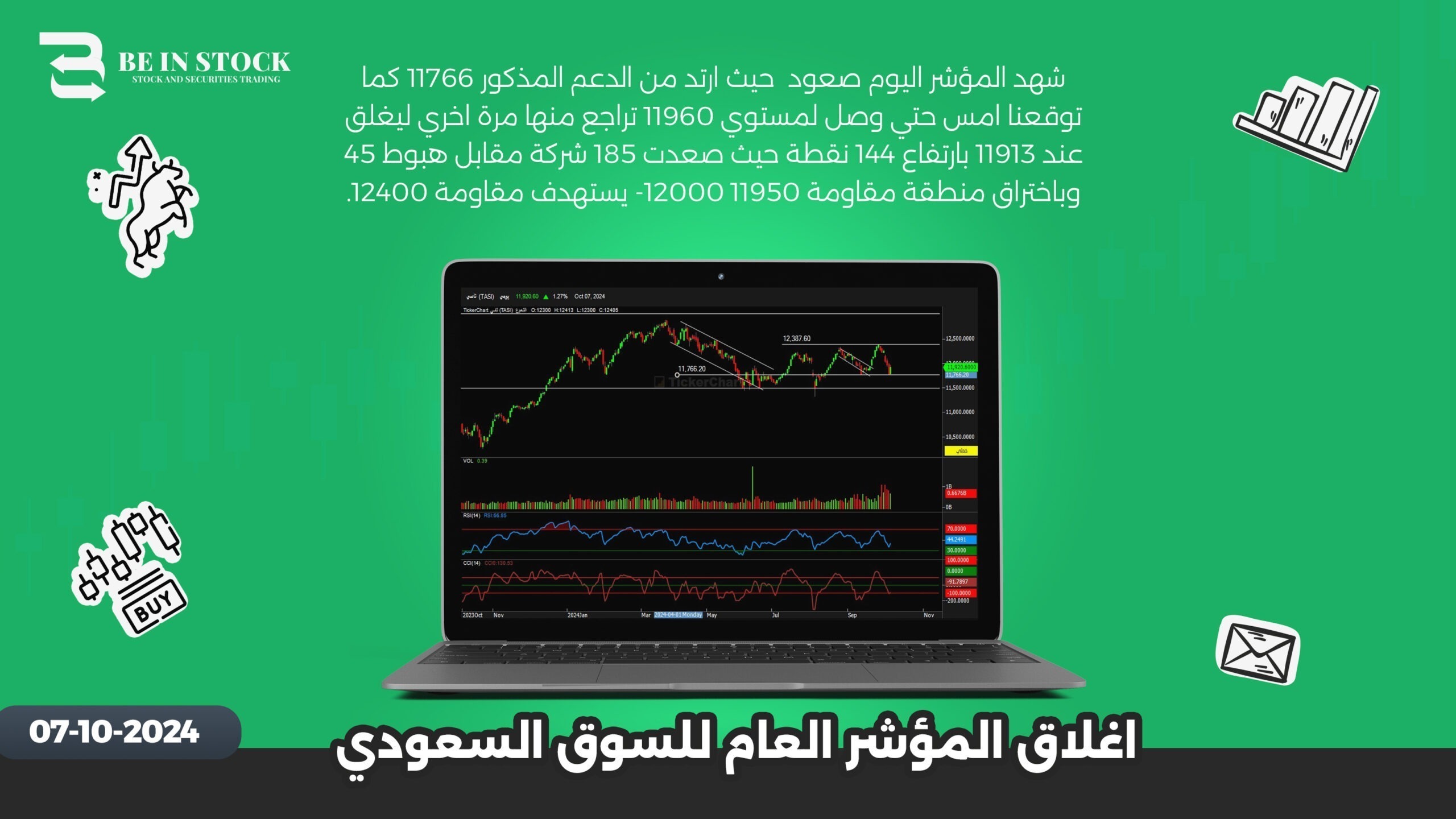شهد المؤشر اليوم صعود حيث ارتد من الدعم المذكور 11766كما توقعنا امس حتي وصل لمستوي 11960 تراجع منها مرة اخري ليغلق عند 11913 بارتفاع 144 نقطة حيث صعدت 185 شركة مقابل هبوط 45 وباختراق منطقة مقاومة 11950 -12000 يستهدف مقاومة 12400.