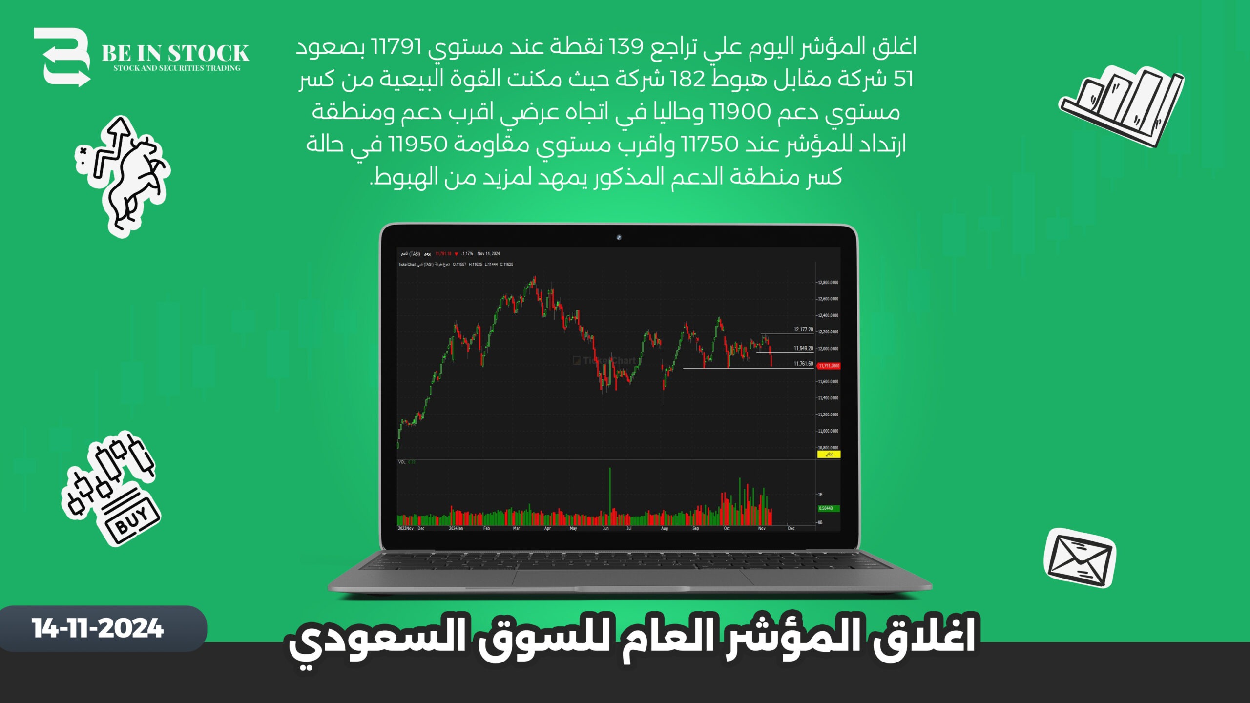اغلق المؤشر اليوم علي تراجع 139 نقطة عند مستوي 11791 بصعود 51 شركة مقابل هبوط 182 شركة حيث مكنت القوة البيعية من كسر مستوي دعم 11900 وحاليا في اتجاه عرضي اقرب دعم ومنطقة ارتداد للمؤشر عند 11750 واقرب مستوي مقاومة 11950 في حالة كسر منطقة الدعم المذكور يمهد لمزيد من الهبوط.