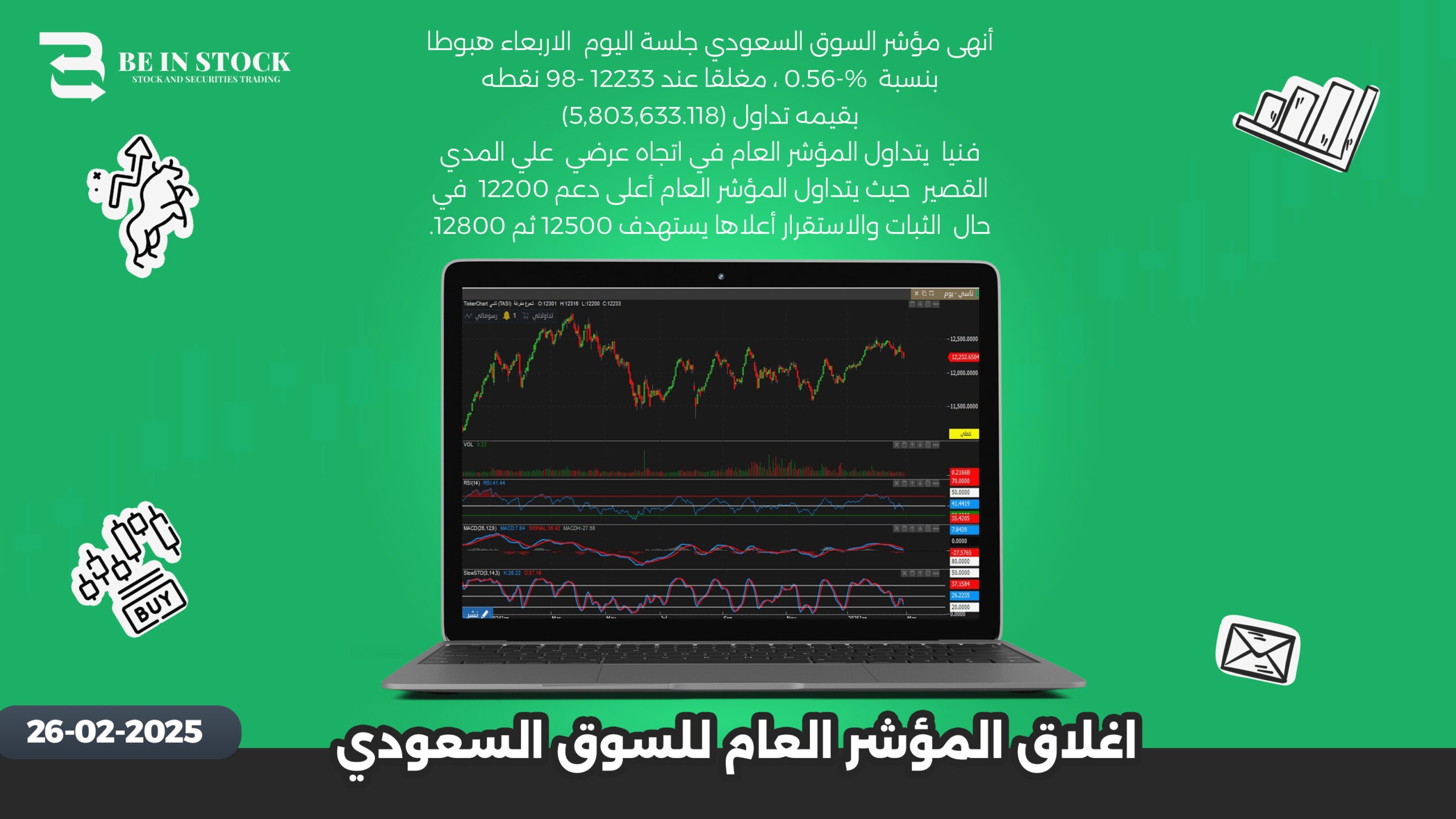 أنهى مؤشر السوق السعودي جلسة اليوم الاربعاء هبوطا بنسبة 0.56-% ، مغلقا عند 12233 98- نقطه بقيمه تداول (5,803,633.118) فنيا يتداول المؤشر العام في اتجاه عرضي علي المدي القصير حيث يتداول المؤشر العام أعلى دعم 12200 في حال الثبات والاستقرار أعلاها يستهدف 12500 ثم 12800.