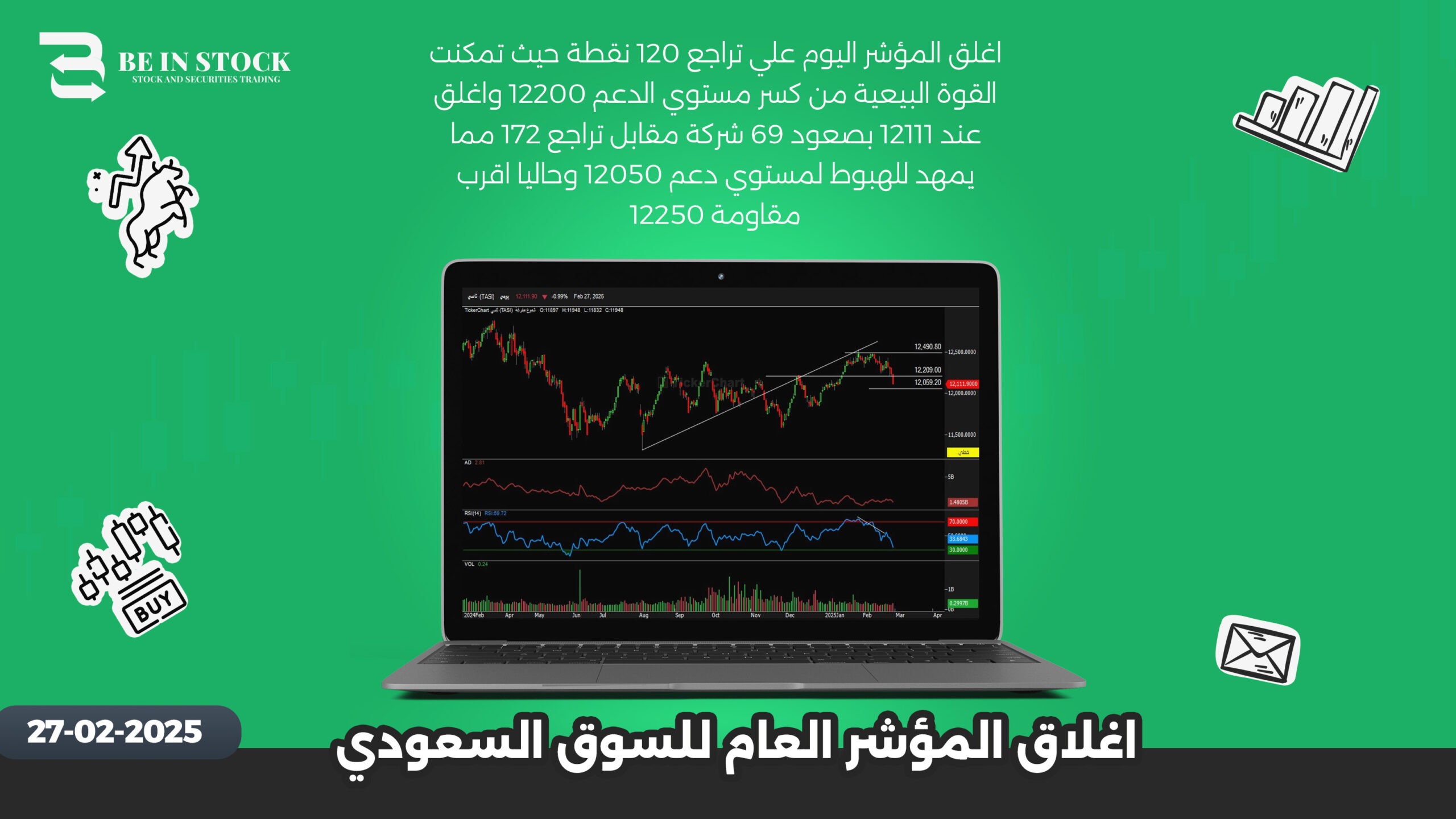اغلق المؤشر اليوم علي تراجع 120 نقطة حيث تمكنت القوة البيعية من كسر مستوي الدعم 12200 واغلق عند 12111 بصعود 69 شركة مقابل تراجع 172 مما يمهد للهبوط لمستوي دعم 12050 وحاليا اقرب مقاومة 12250