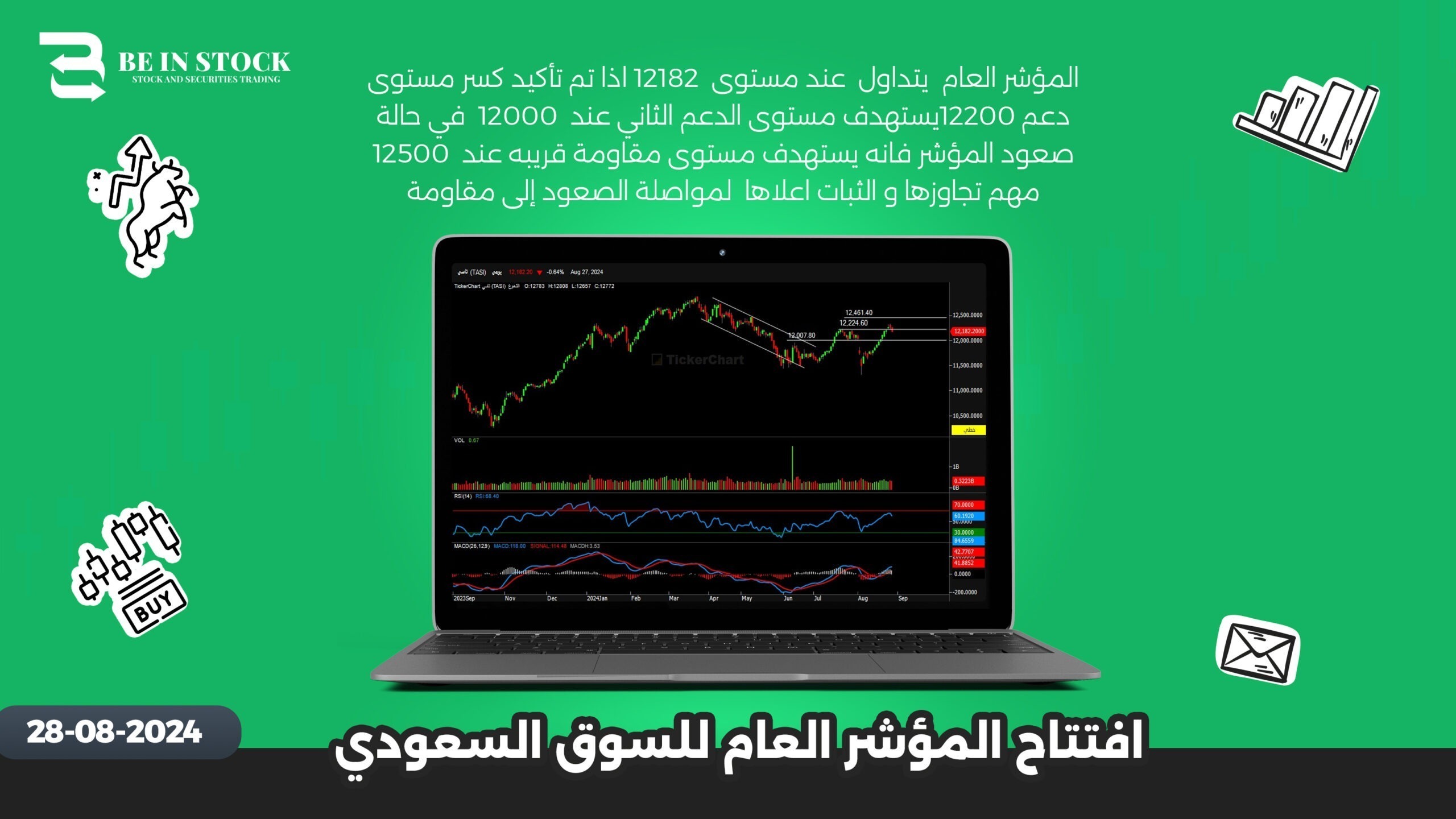 المؤشر العام يتداول عند مستوى 12182 اذا تم تأكيد كسر مستوى دعم 12200يستهدف مستوى الدعم الثاني عند 12000 في حالة صعود المؤشر فانه يستهدف مستوى مقاومة قريبه عند 12500 مهم تجاوزها و الثبات اعلاها لمواصلة الصعود إلى مقاومة 12700 السوق إيجابي بالثبات اعلي دعم 12200