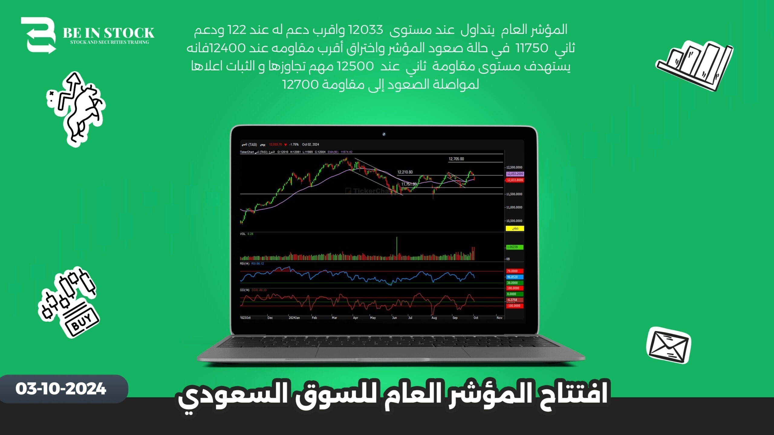 المؤشر العام يتداول عند مستوى 12033 واقرب دعم له عند 122 ودعم ثاني 11750 في حالة صعود المؤشر واختراق أقرب مقاومه عند 12400فانه يستهدف مستوى مقاومة ثاني عند 12500 مهم تجاوزها و الثبات اعلاها لمواصلة الصعود إلى مقاومة 12700