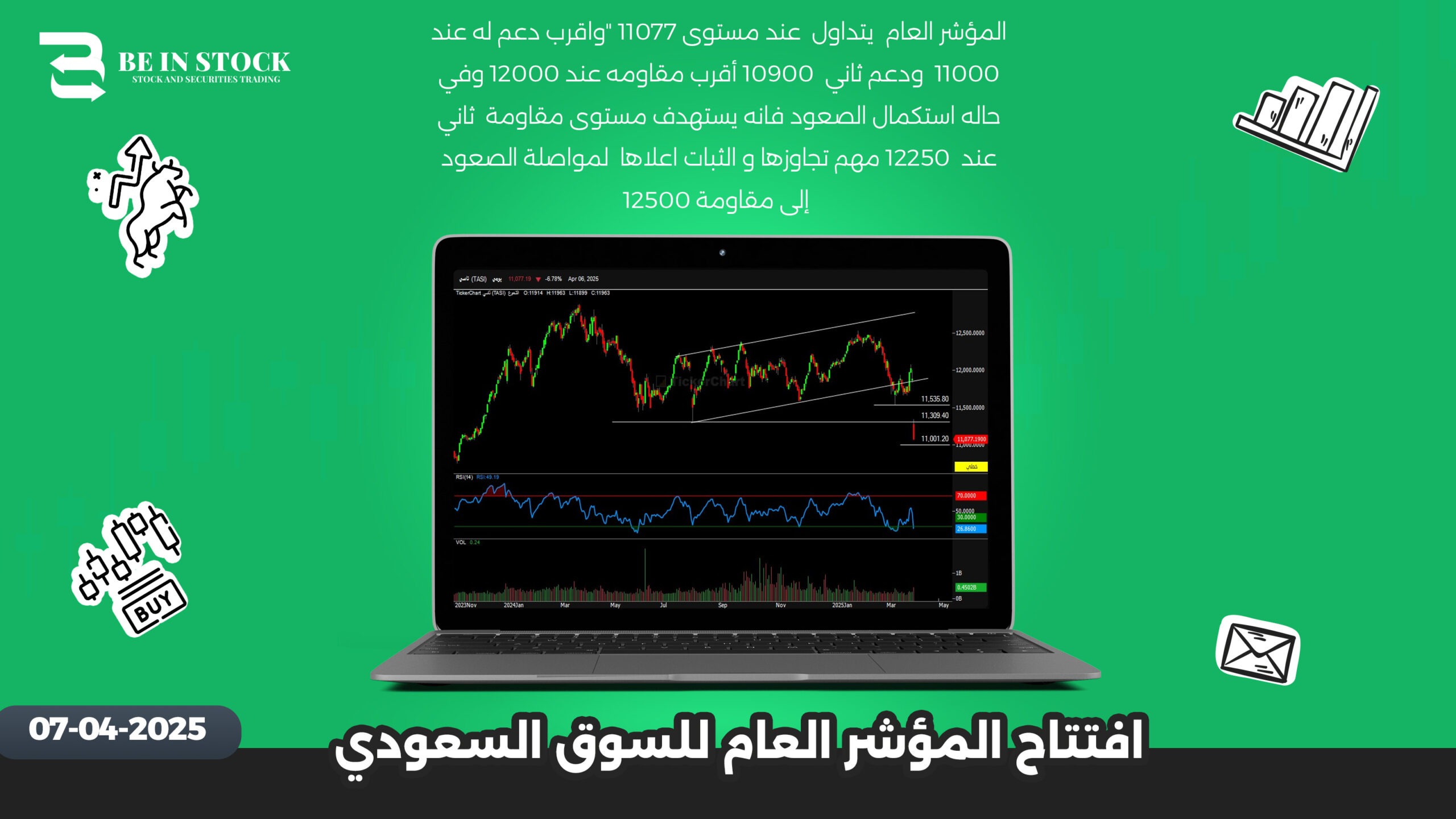المؤشر العام يتداول عند مستوى 11077 “واقرب دعم له عند 11000 ودعم ثاني 10900 أقرب مقاومه عند 12000 وفي حاله استكمال الصعود فانه يستهدف مستوى مقاومة ثاني عند 12250 مهم تجاوزها و الثبات اعلاها لمواصلة الصعود