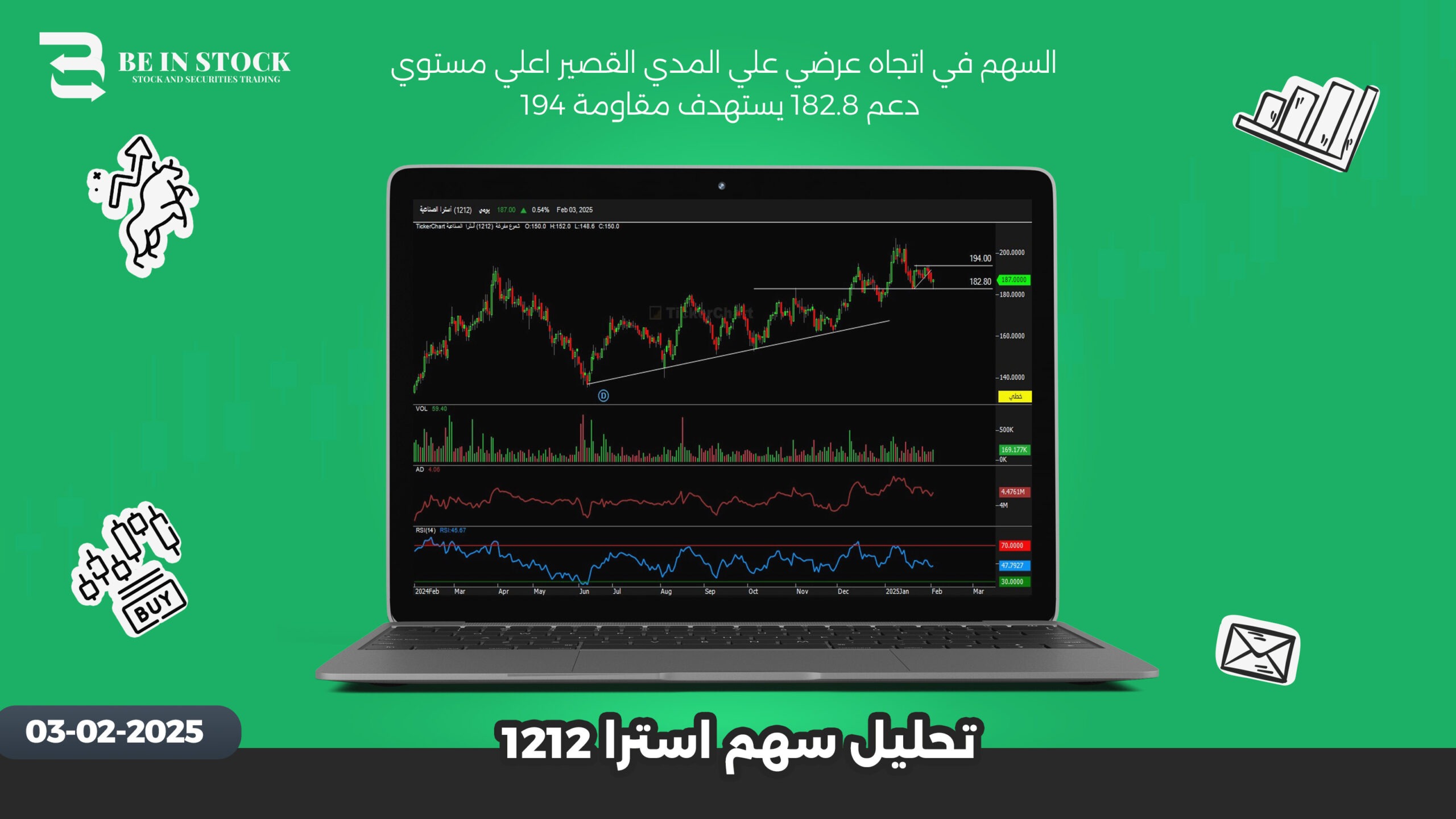السهم في اتجاه عرضي علي المدي القصير اعلي مستوي دعم 182.8 يستهدف مقاومة 194