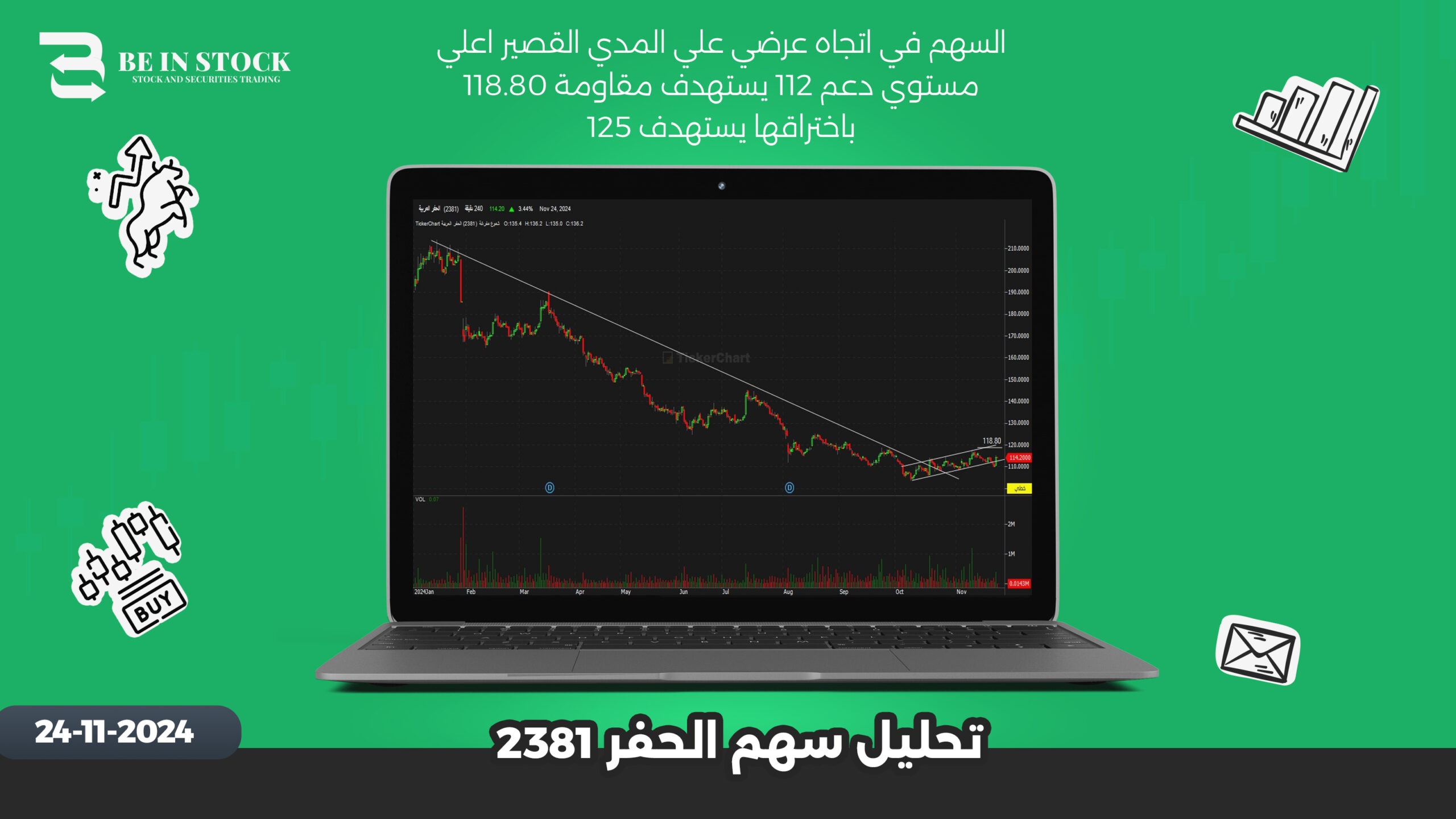 السهم في اتجاه عرضي علي المدي القصير اعلي مستوي دعم 112 يستهدف مقاومة 118.80 باختراقها يستهدف 125