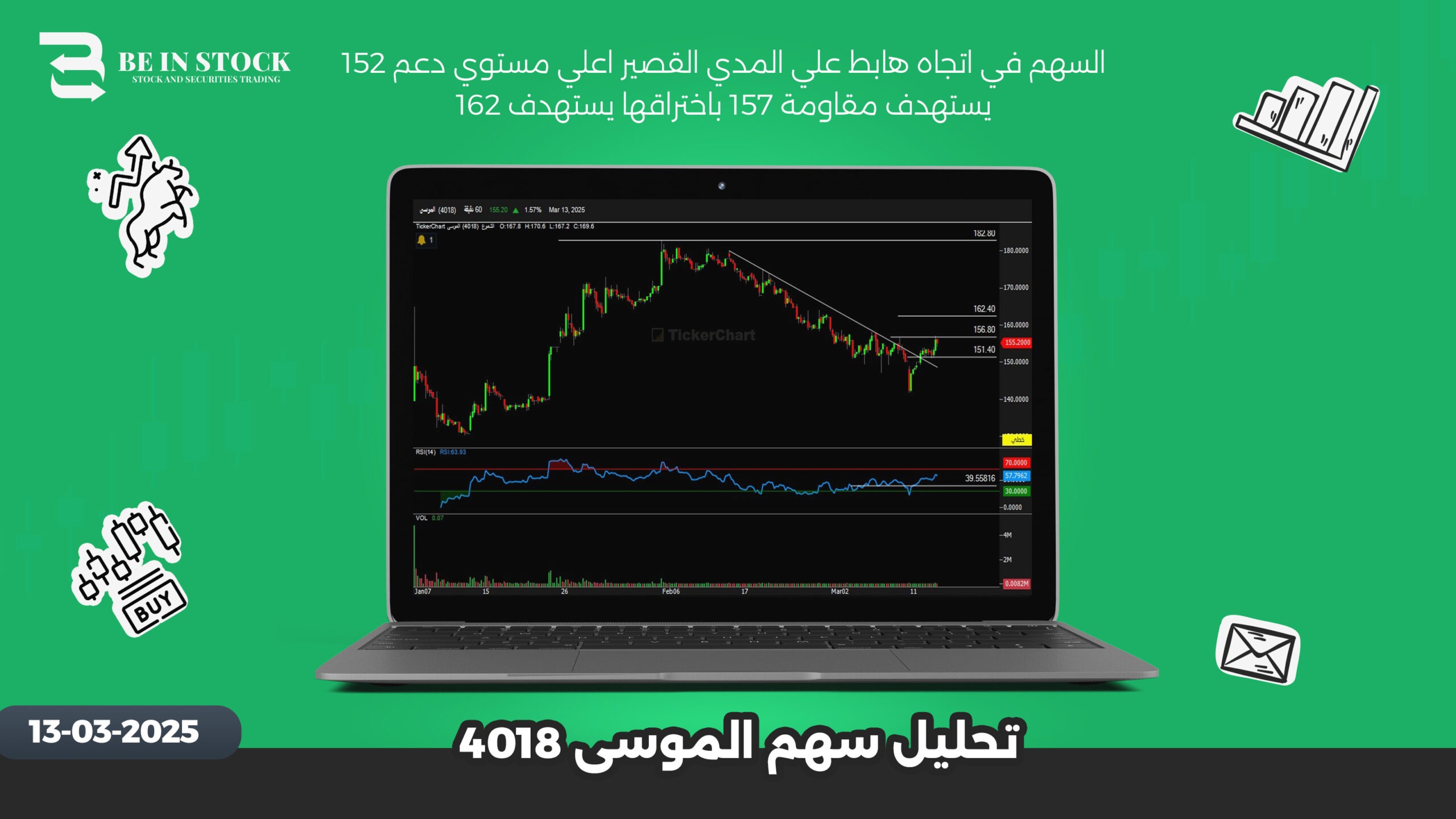 السهم في اتجاه هابط علي المدي القصير اعلي مستوي دعم 152 يستهدف مقاومة 157 باختراقها يستهدف 162