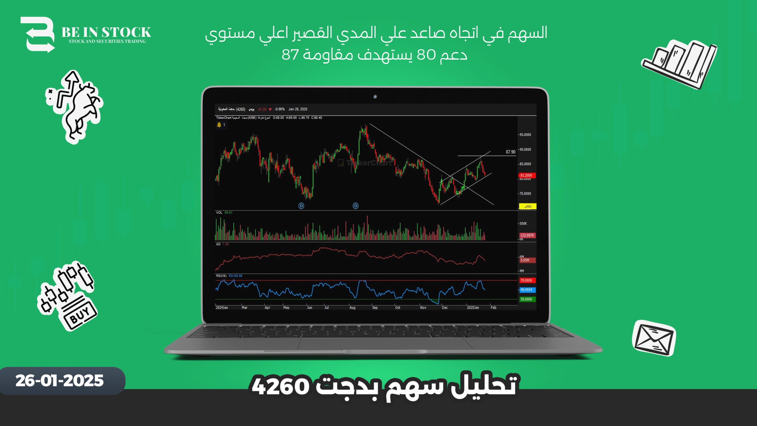 السهم في اتجاه صاعد علي المدي القصير اعلي مستوي دعم 80 يستهدف مقاومة 87