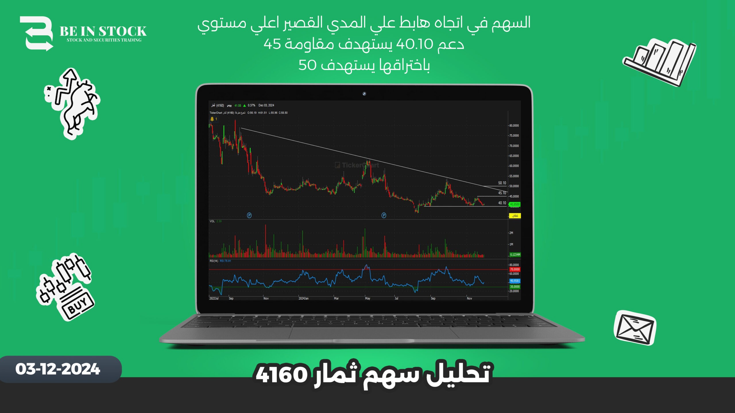 السهم في اتجاه هابط علي المدي القصير اعلي مستوي دعم 40.10 يستهدف مقاومة 45 باختراقها يستهدف 50
