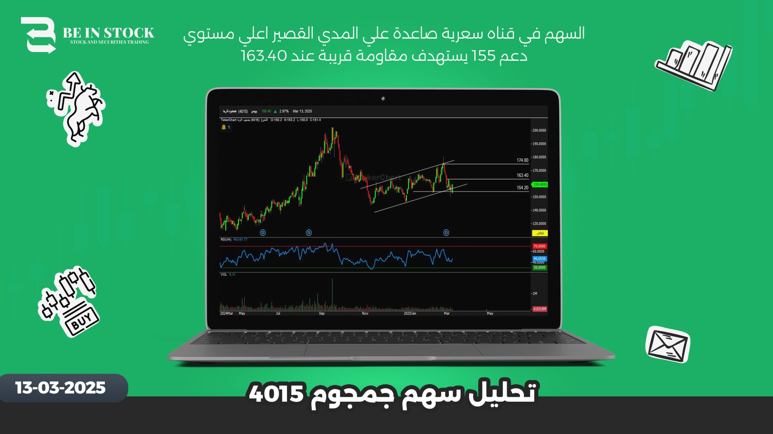 السهم في قناه سعرية صاعدة علي المدي القصير اعلي مستوي دعم 155 يستهدف مقاومة قريبة عند 163.40