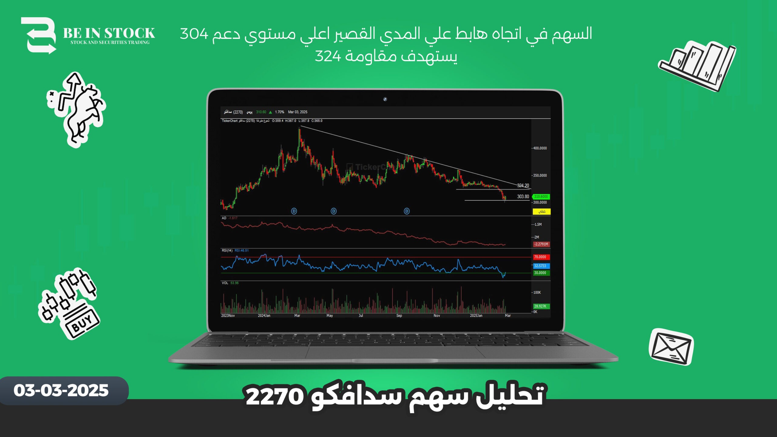 السهم في اتجاه هابط علي المدي القصير اعلي مستوي دعم 304 يستهدف مقاومة 324