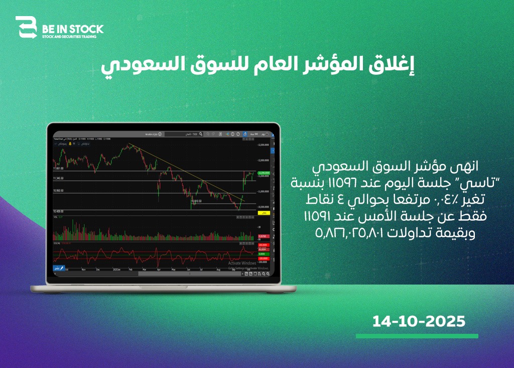 انهى مؤشر السوق السعودي ”تاسي“ جلسة اليوم عند 11596 بنسبة تغير %0.04 مرتفعا بحوالي