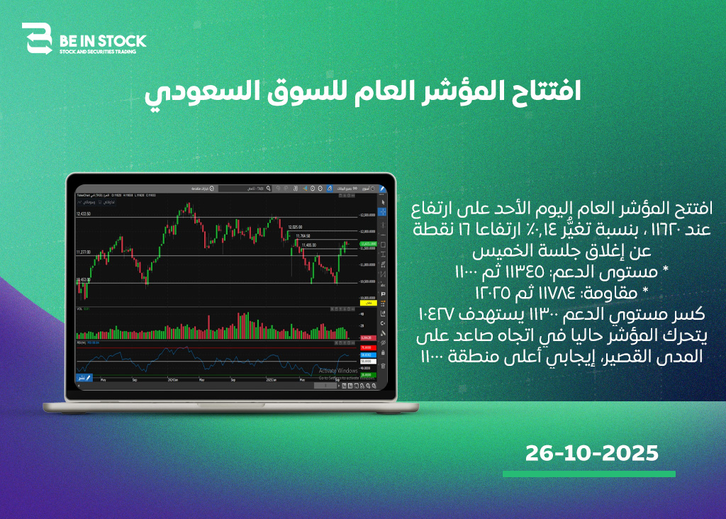 افتتح المؤشر العام اليوم الأحد على ارتفاع عند 11620 ، بنسبة تغيُّر 0.14% ارتفاعا