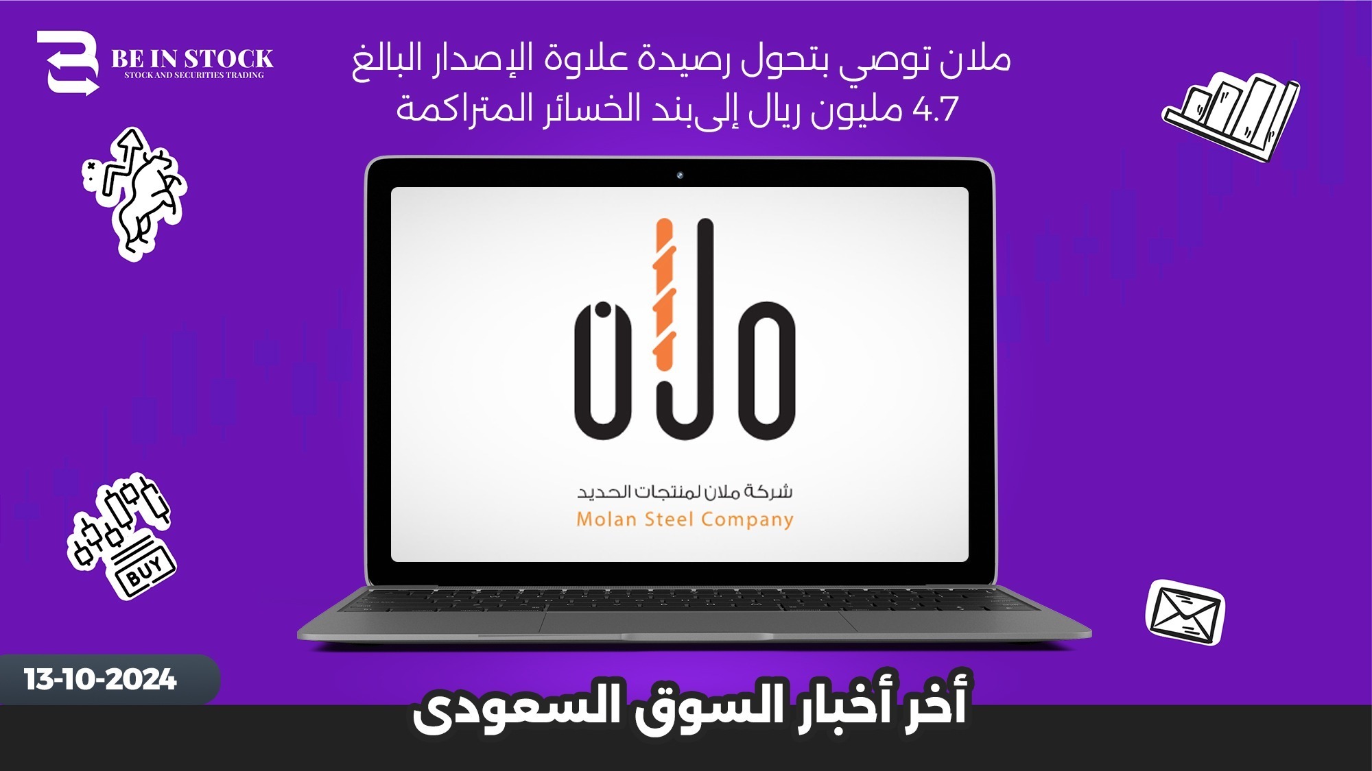 أعلنت شركة مُلان لمنتجات الحديد عن توصية مجلس إدارتها بتاريخ 10 أكتوبر 2024 إلى الجمعية العامة الغير عادية بالموافقة على تحويل رصيد علاوة الإصدار البالغ 4.7 مليون ريال سعودي كما في 30 يونيو 2024م، إلى بند الأرباح الخسائر المبقاة، وذلك لإطفاء خسائر الشركة المتراكمة والبالغة 3.7 مليون ريال سعودي والتي تمثل 13.9% من رأس المال، كما في القوائم المالية لفترة الستة أشهر المنتهية في 30 يونيو 2024م.