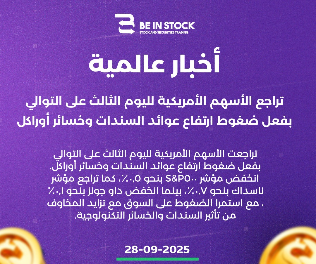 تراجعت الأسهم الأمريكية لليوم الثالث على التوالي بفعل ضغوط ارتفاع عوائد السندات وخسائر أوراكل. سبتمبر 29, 2025 لا توجد تعليقات