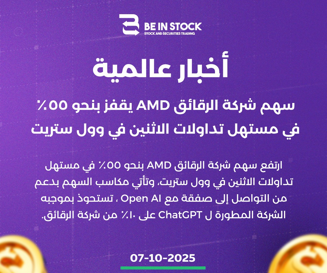 سهم شركة الرقائق AMD يقفز بنحو 55% في مستهل تداولات الاثنين في وول ستريت أكتوبر 7, 2025 لا توجد تعليقات