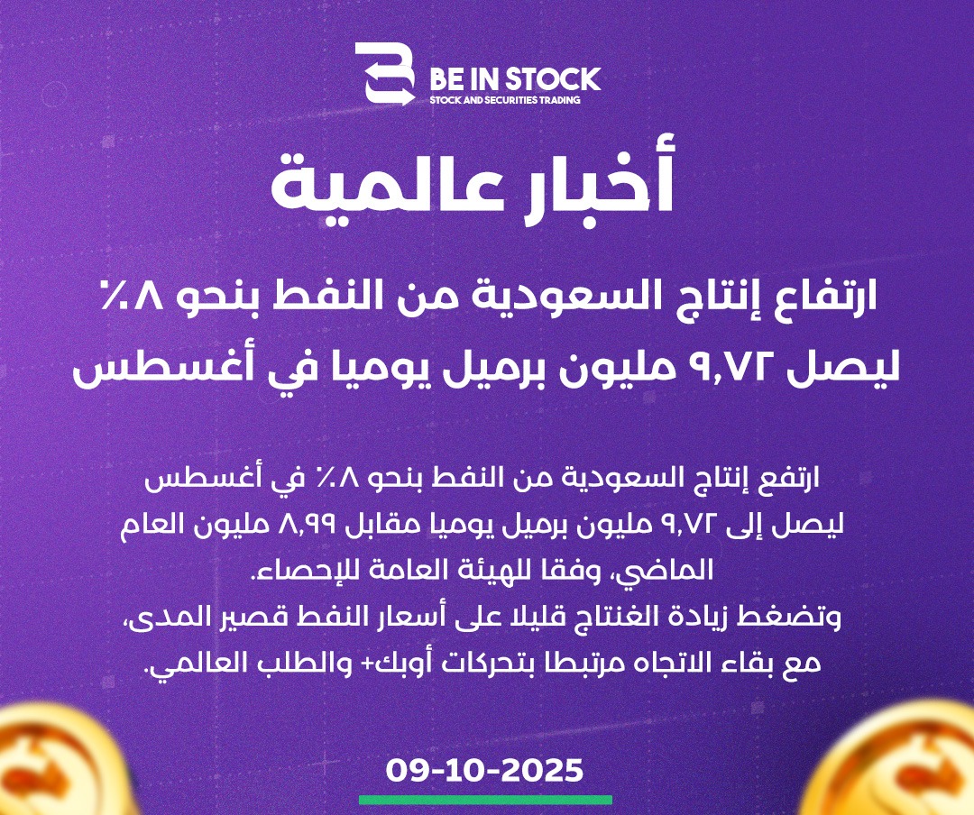 ارتفاع إنتاج السعودية من النفط بنحو 8% ليصل 9.72 مليون برميل يوميا في أغسطس أكتوبر 9, 2025 لا توجد تعليقات