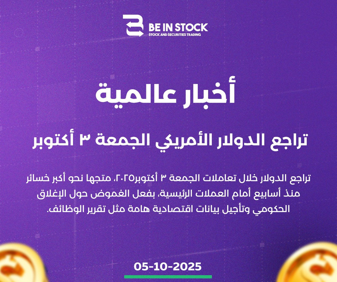 تراجع الدولار خلال تعاملات الجمعة 3 أكتوبر2025، متجها نحو أكبر خسائر منذ أسابيع أمام