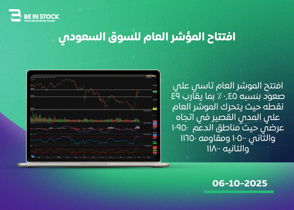 افتتح الموشر العام تاسي علي صعود بنسبه 0.45 % بما يقارب 49 نقطه حيث